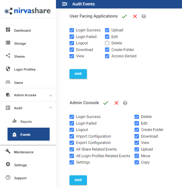 Audit events can be selectively enabled or disabled for Admin Console and User Application. Events related to admin and delegated admin users are tracked as part of Admin Console Audits. End user events are tracked as part of User Application Audits. Only those audit events that are enabled are tracked and data will be persisted in database.