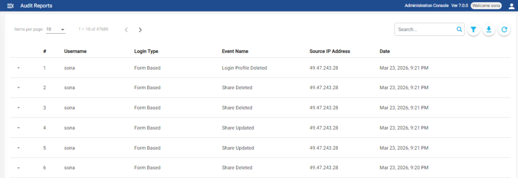 Audit data that gets generated based on enabled events can be queried to generate required reports with filter criteria. The filter criteria includes, event type, date range, etc. You can also search based on username. For example, you can provide a date range and query all events that happened on particular day or time or just enter a username in the search box to get all events based on a username.