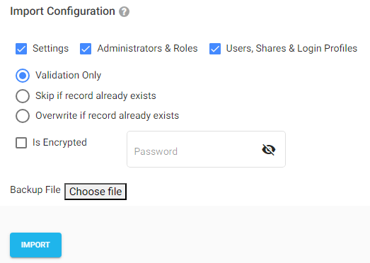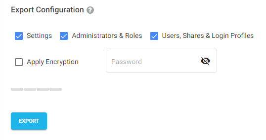 During the export process, the data can be exported into .bkp file by selectively picking specific part of the data such as Settings, Users, Shares & Login Profiles. You can also enable encryption for the backup file by providing a password.