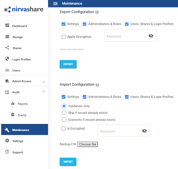 A must need aspect of any application is the import and export of configurations. Entire data related to Shares, Login Profiles, Users, Administrators, Roles and Settings can be exported as an archive file and same can be restored back in the system. This feature is suitable during data migration from one server to another or as a partial data import from the backup configuration.