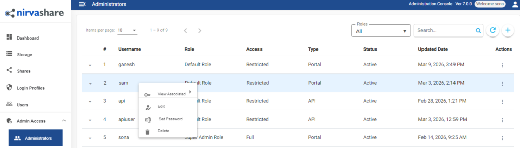 < All Topics Main Administrative Guide Users Set Password for Admin User Set Password for Admin User A new password can be set for other delegated admin users. Only super admin users with full access rights can set the password to other admin users.To set a new password, follow the below steps.From the Admin Console click on Admin Access and then on Administrators.Right click or click on Actions on the user and select Set Password.Provide a new password and make sure the strength is good for better security.Click on UPDATE to set the password.