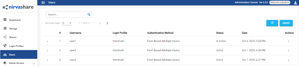 Users are those users who just need access to files but do not necessarily need admin privileges like managing shares, login profiles, etc. Access users like employees, customers, partners, etc. can only perform file actions such as download, upload, delete, etc. based on the permission given to them.