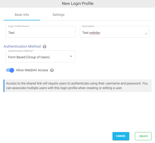 - Click on CREATE to create the WebDAV Login Profile.