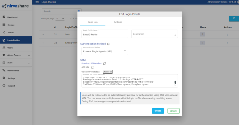 - Login to NirvaShare Admin Console and edit the Login Profile that was created based on the steps from previous section.